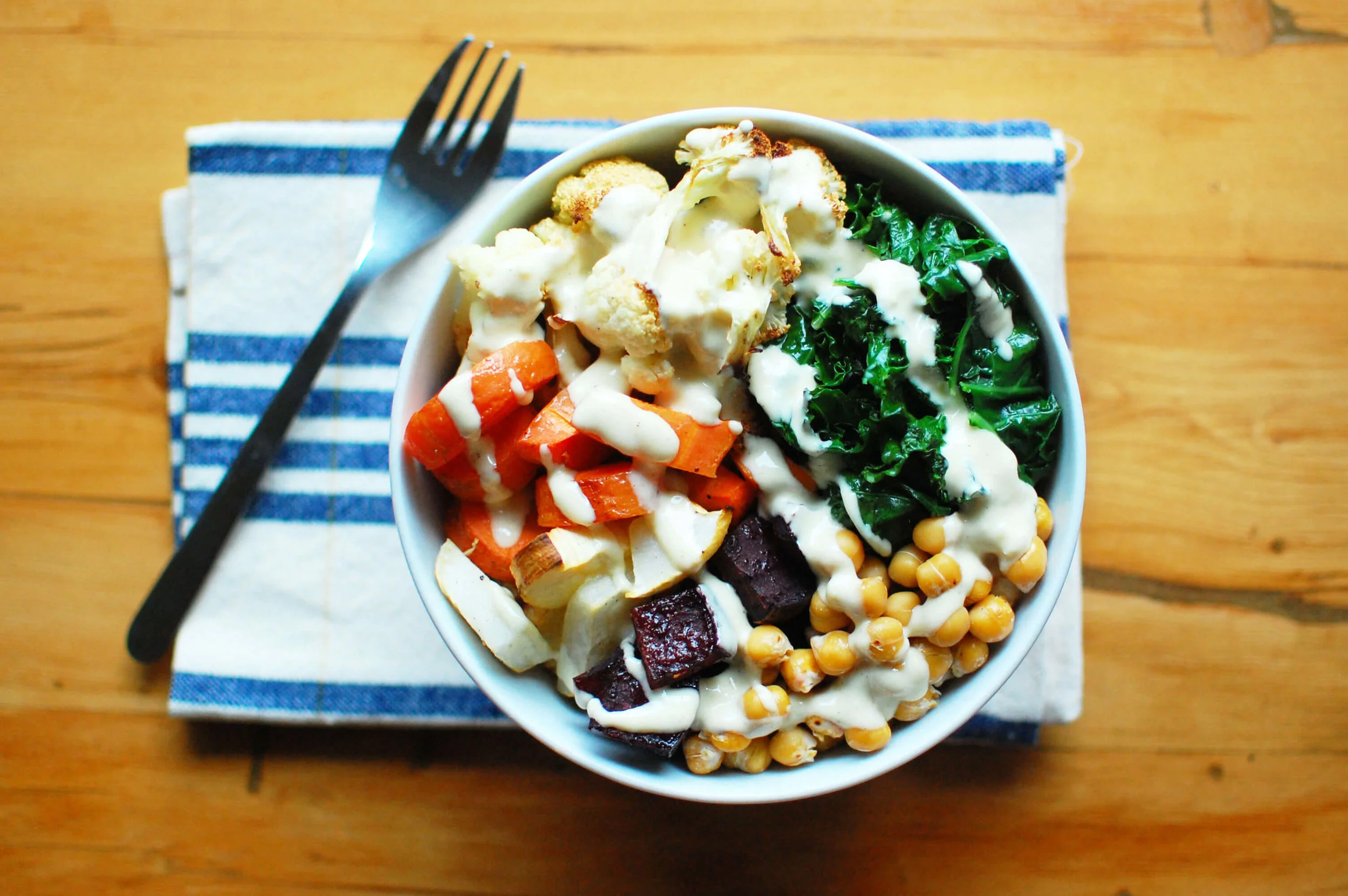 Assemble your Buddha bowl by placing quinoa in the bottom of a bowl and arranging roasted winter vegetables, sautéed kale and warm chickpeas on the top. Drizzle desired amount of dressing over the bowl.